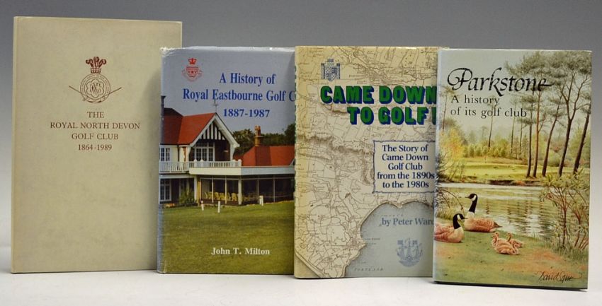 Selection of South Coastal Golf Club Histories to include Parkstone GC, Came Down GC 1890-1980, Royal Eastbourne GC 1887-1987 and Royal North Devon GC 1864-1989, in varying conditions, some wear to covers and DJs fading to spine to some, otherwise generally ok, A/G condition (4)