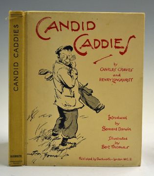 Graves, Charles and Longhurst, Henry - "Candid Caddies" 1st ed 1935 with the original pictorial paper and cloth backed boards and spine - with introduction by Bernard Darwin. Illustrated with humorous drawings by Bert Thomas - some dust stains along the lower edges, thumb damage to the top of the spine, hinge visible to the rear backplate, some discolouration to the rear and front free endplates (F)