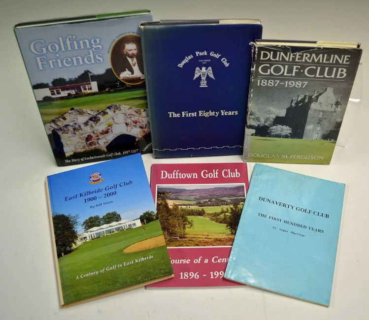 Selection of Scottish Golf Club Histories including Dunaverty GC the first hundred years, Dufftown GC 1896-1996, East Kilbride GC 1900-2000, Dunfermline 1887-1987, Lochwinnoch GC 1897-1997 and Douglas Park GC the first eighty years, with some fading to various books, with wear throughout, mixed conditions overall A/G (6)