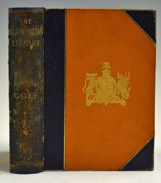 Hutchinson, Horace G - 'Golf - The Badminton Library' 5th ed fully revised 1895 in half leather and decorative gilt cloth boards - with contributions by Lord Wellwood, Sir Walter Simpson, A J Balfour, Andrew Lang, Everard and others - rare edition - some wear to extremities, rebound retaining original gilt spine hence overall (F/G) Note: Generally accepted as one of the finest golf books ever written with portions of the book dealing with equipment and course design being invaluable information for historians of the game.