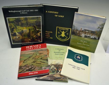 English Golf Club Centenaries to incl' signed 'The Story of Malden Golf Club' 1st edition 1990 signed by the author Robin Gems to the front free end plate, 'A History of Handsworth Golf Club' 1st ed 1996 c/w dust jacket (teacup stains and some minor creases and nicks), 'Penrith Golf Club 1890-1990' 1st ed 1991 in the original green and gilt decorative leather boards (title page stuck in with Sellotape) otherwise very clean copy, 'Wellingborough Golf Club 1893-1993' 1st ed 1992 c/w original dust jacket and 'Hornsey Golf Club 1898-1998' 1st ed 1998 c/w with dust jacket (G) and 'Coventry Golf Club 1887-1987' 1st ed 1988 in the original wrappers, general condition is mixed A/G (6)