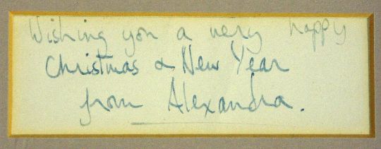 Royalty HRH Princess Alexandra signed Christmas message and print display The Honourably Lady Ogilvy, first cousin to the Queen, dated 1959 Christmas with a head shot portrait print with the message 'Wishing you a very happy Christmas and New Year, from Alexandra' below in ink, overall measurement 24 x 34cm, mounted framed and glazed in good, clean condition