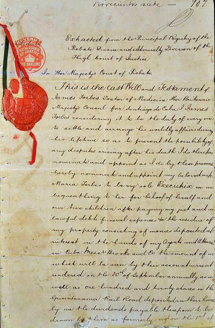 James Forbes Probate Document dated 1862 the last will and testament to James Forbes Doctor of Medicine Her Britannic Majesty's Consul for Santiago de Cuba, 'I James Forbes considering it to be the duty of every one to settle and arrange his worldly affairs during his lifetime', stamped with Royal Courts of Justice One Shilling and a perished red wax seal, signed by registrar Edward Fenner and a witness, written in ink on paper, some tears to bottom edges, small tears present, text readable, overall condition average