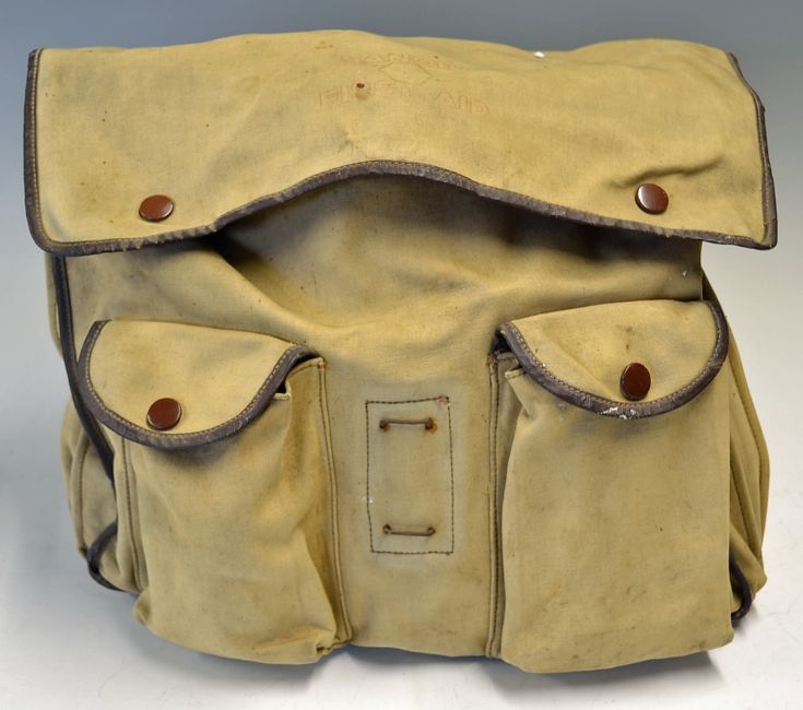 Sanoid First Aid Satchel including medical equipment such as 2 x Tourniquets with original instructions, 2x Extension Splint sets, 20x Plain Triangular Bandages, 5x Large First Aid Dressings, 3x Absorbent Cotton Wool, 4x Medium dressings, 1x clean cotton rags, 2x Splint straps, 3 Extra fine bandages, most Cuxson, Gerrard & Co paper wrappers, a handful of tourniquet wooden pegs, and safety pins, also a quarter bottle of iodine, most appear unused and unopened, the satchel has two outer pockets, is made of canvass and has various flaps in which to protect the contents, overall measurement 40 x 25 x 35cm approx.
