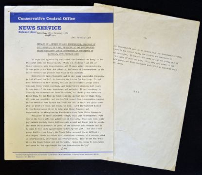 Political Margaret Thatcher Trade Union original speech 1976 'Speech By The Rt Hon Mrs Margaret Thatcher, MP at The Tunac Annual Conference, Manchester' dated 28th February 1976, scarcely available on the market, typed on fine paper, content page titled Structure; Co-operation, not conflict, Introduction - Myth, Conservative attitude to Trade Unions, Trade Unions need a Free Society to flourish, But not to exclusion of Individual Freedom, Democracy in Unions, No Major Legislation, Numbers of Trade Unions, Participation, No difficulty in working together, but Parliament supreme and Be Conservative win through, approx. 43pp, in very good condition, with holes punched continuously to the top left corner, a real collector's piece, t/w typed Extract of a speech by Lord Thorneycroft, Chairman of the Conservative Party speaking at the Trade Unionist's conference 28th February 1976 (2). Note: The provenance to the speech is that the aircraft belonged to UB Aviation and was owned by the Chairman of United Biscuits, Sir Hector Laing. It was given as a gift to the Chief Flight Engineer for the primary aircraft Beechcraft King Air Super 200, call sign G-HLUB. Based at Denham Aerodrome in Buckinghamshire, frequent passengers included company executives from other holdings and other high profile friends and associates of the Chairman, which included Margaret Thatcher and HRH The Prince of Wales. On one occasion the Chief Flight Engineer and Captain were called upon to collect Mark Thatcher and fly him back to the UK in the company aircraft following the incident when he had gone missing in the Sahara desert for 6 days during the 1982 Paris-Dakar rally