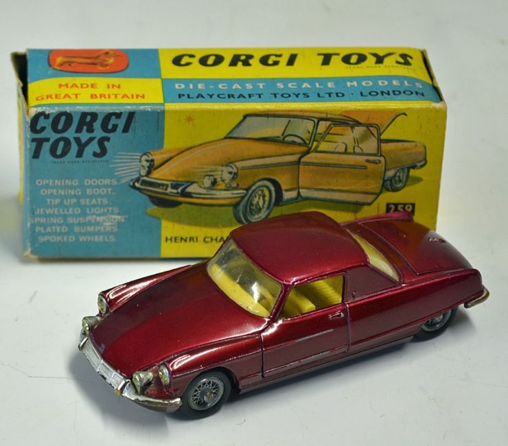Corgi Toys Le Dandy Coupe Henri Chapron Body on Citroen DS Chassis No. 259 maroon in original box, scratches to paintwork, bumpers missing chrome, jewelled front lights good, some dusting to interior, box is faded to one side otherwise ok