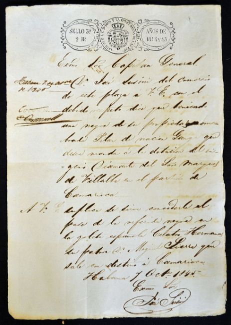 Slavery 1845 of Historical Importance 19th Century Passport for an Ethnic Slave a rare item in itself but even more so because the slave in question belonged to a known Cuban Tobacconist Jose Susini, dated October 1845, also signed by Leopoldo O'Donnell who was the governor general of Cuba at the time and approved all ethic slave passports, also a Spanish general and statesman, a single sheet in clean condition