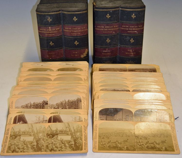 South Africa Boer War Stereoscope Slides 1901 a selection of South African War Through The Stereoscope slides, including Part I Vol I & II and Part II Vol I & II, encased within book shaped slip cases, Part I complete 72 cards, approx. 70 cards in Part II, pub' by Underwood & Underwood, dated 1901 to the bottom, both boxes have some wear, otherwise generally average to good condition