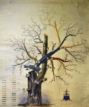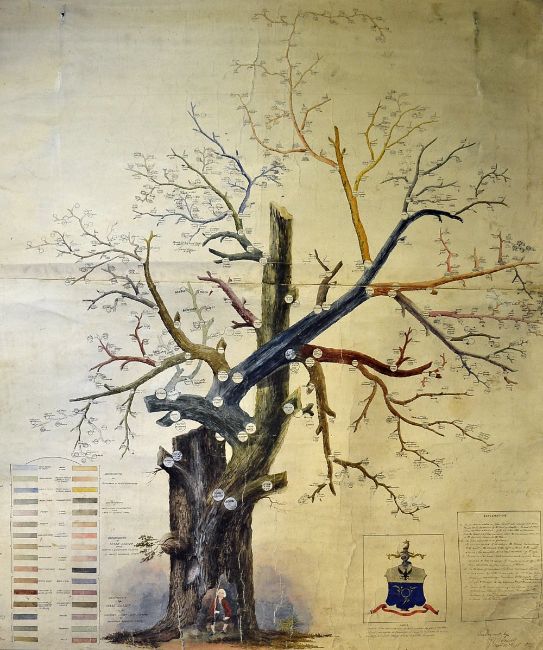 Genealogy Gosset Family Tree hand drawn and painted in colour on paper and canvas, wonderfully detailed and presented, top of canvas is nailed to wood and ready to hang, measuring 101cm x 117cm, depicting Isaac Gosset sat within a large tree surrounded by colourful branches with names of all parts of the family, family crest/coat of arms to bottom left, signed and dated 1874 to the bottom, some cracking to front, although all still clear and readable. Note: Jersey-born Isaac Gosset was the son of Huguenot refugees who became an accomplished artist, including Royalty and gentry among his subjects.