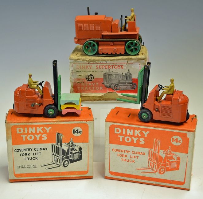 Selection of 3x Dinky Toys to include Heavy Tractor No. 563, Coventry Climax Forklift Truck No.14c and another example of No.14c with a different box (3)