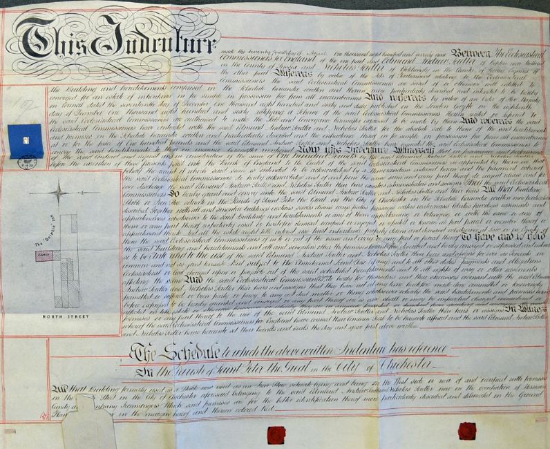 Sussex Conveyance Indenture 1879 between The Ecclesiastical Commission for England and Edmund Andrew Sadler of Bepton, Sussex, dated 24th April, for the sum of £100 in relation to the purchase of a stable, illustrated to the left, ornate title, with wax seals attached, in vellum, measuring 72 x 59 approx, in very good condition, folds present