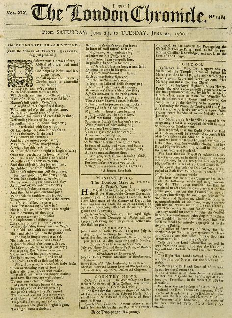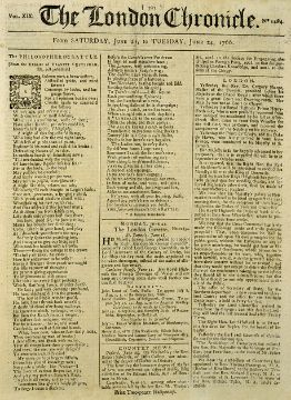 The London Chronicle Newspaper 1766 dated 12 Jun - 24 Jun information relating to Commodore Byron, in his late expedition, settled a colony at the Isles Malomines, or Falkland Island. First discovered in 1706 and may be of great use to Britain in any future rupture with Spain. P8, clean condition
