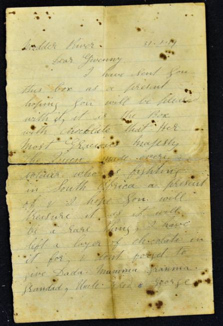 South Africa Boer War Chocolate Tin 1900 complete with Rowntree & Co chocolate (not edible), heavily mossed, with original note from explaining that the chocolate should be shared between family, still a clear note from 'Loving Uncle Jim', has paper and tissue packing, t/w an empty tin, both having scratches and marks (2)