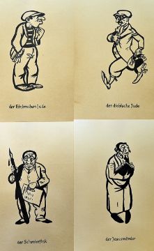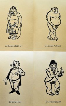 WWII German Propaganda Phillip Rupprecht Original Drawings dated 1941 with 'PR' to all, known as fips, single figure drawings with noted titles 'The degenerate Jew', The Exploiter Jew', 'Tailor', 'Street vendor', 'Jesus murderer', Burgulars Jew', 'Thieving Jew', 'Children Butcher', 'Naked Truth', 'Cheeky Jew' and 'Greasy Jew', part of the Nazi Propaganda, anti-Semitic caricature drawings were produced depicting Jews as ugly characters and exaggerated facial features, 12 in total, in very good clean condition, black ink on card, scarcely available (12)