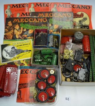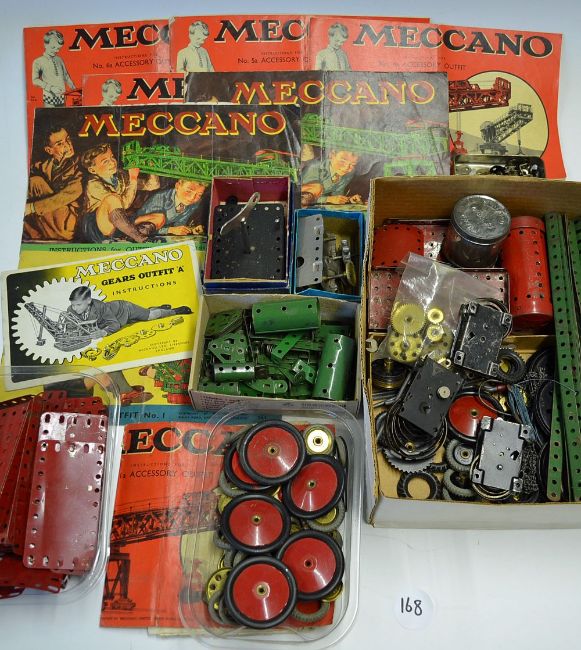 It's Meccano Time! Assorted Collection consisting of One Assembled Meccano Model from set 5 - model 5.25 - steerable Heavy Goods Lorry, t/w a large collection of Meccano, the constituent parts of at least sets 1-7, plus innumerable additions and extras. The sets were predominantly from the period 1950 -1953, red and green, with a number of silver-metal pre-War parts added. Also including parts from a Meccano Gears Outfit No. A, together with its instruction booklet. Instruction books for outfits 1, 2 and 3, with books for accessory outfits 3a, 4a, 5a and 6a to build up to set 7. Many additional parts and wheels, t/w Meccano Aero Clockwork Motor No.2 Part M231, original box with key, Meccano Clockwork Motor No.1 (Reversing) in original box with key and leaflet and three Meccano Magic Motors, worth inspecting, in good condition (Quantity)