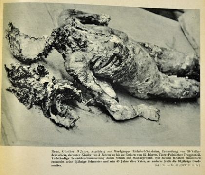 Documents of Polish Atrocities Book dated 1940 Berlin publication by the German Information Center following order by the German State Dept to document atrocities allegedly inflicted by Poles onto German civilians and soldiers. 456 pages of cases and photographs, in German language, horrific scenes, in plain cardboard covers with black lettering, rarely on the market, two small tears to two pages, minor wear to covers, otherwise all appears in clean condition
