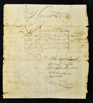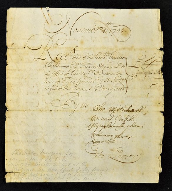 War of the Spanish Succession Siege of Gibraltar 1704 Document Office of Ordinance Document to pay 6 Bombardiers going to Gibraltar each 8 Guineas. Endorsed on reverse and signed by the 6 men that they each received this money. Manuscript document, 20 x 22cm, single sheet with minor tears, foxing, text clear, with several signatures including William Bridges who owned Kenwood House in Hampstead. Christopher Musgrave 4th Bt. (1664-1718). Of particular interest James Craggs the elder (1657-1721) was an English politician closely associated with the Duke of Marlborough, was Postmaster General but was heavily implicated with the disaster of the South Sea Bubble in 1720. Note: The Anglo Dutch attacked Gibraltar on 1 August 1704 and the Spanish governor Diego de Salinas surrendered after a siege, which only lasted three days. Within a few weeks, Spanish forces began assembling to the north of Gibraltar (now La Línea de la Concepción) for an attempt to re-take the fortress. After this siege, which comprised a six-month bombardment and blockade from the isthmus linking Gibraltar to the mainland, the garrison was no closer to surrendering and the Franco-Spanish army abandoned the siege.