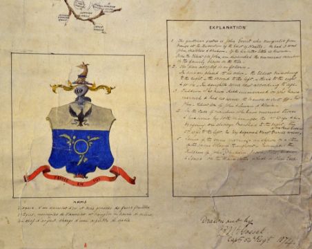 Genealogy Gosset Family Tree hand drawn and painted in colour on paper and canvas, wonderfully detailed and presented, top of canvas is nailed to wood and ready to hang, measuring 101cm x 117cm, depicting Isaac Gosset sat within a large tree surrounded by colourful branches with names of all parts of the family, family crest/coat of arms to bottom left, signed and dated 1874 to the bottom, some cracking to front, although all still clear and readable. Note: Jersey-born Isaac Gosset was the son of Huguenot refugees who became an accomplished artist, including Royalty and gentry among his subjects.