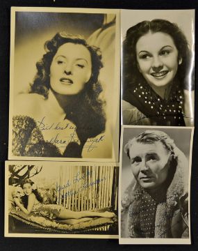 Autograph Selection of Signed Entertainment portrait photographs c1940s to include Anthony Wager, Kim Hunter, Barbara Stanwick, Jean Simmons, Trevor Howard, John Mills x2, Margaret Lockwood, Dorothy Lamour, Bonar Colleano, Paul Dupris, Ann Todd, all hand signed on black and white photographs, t/w 13 facsimile signed portrait photograph (25)