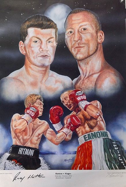 Boxing Ricky Hatton Signed Print a colour print 'Hatton v Magee' 2002 Manchester signed by the artist Meadows, measures 42 x 59cm approx.