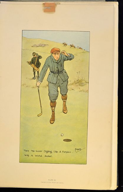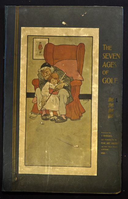 Rare J Hassall "The Seven Ages of Golf" portfolio published by Fine Art Society London 1899 - c/w the original illustrated boards, title page together with the introduction by Horace Hutchinson, coloured lithograph plates have minor knocks to corners and some dust stains - boards soiled and but still rare to find