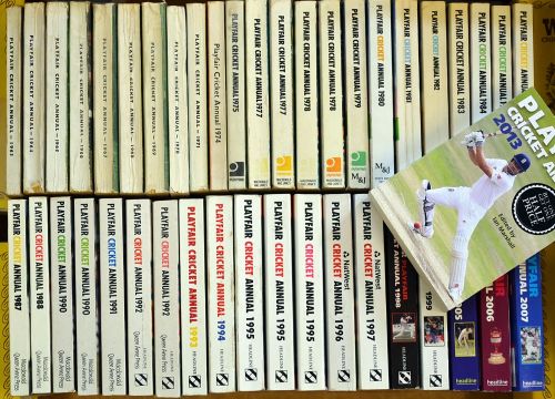 Collection of Playfair Cricket Annuals from 1963 to 2013 (43) - to incl 1963 to 1971, '74, '75, 1977 to 1988, 1990 to 1999 plus '05 to '07 and 2013 - some duplicates overall (G), plus 1919 WG Grace cricket book - titled "The Memorial Biography of Dr WG Grace" 1st edition 1990 issued under the auspices of the MCC, original blue cloth hard back with the MCC, 1 Box