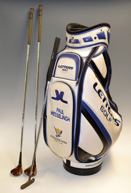 Letters sponsored blue and white full size tour bag and clubs - embossed with Paul Wesselingh to the panels c/w 2x MacGregor Tourney woods and Jack Nicklaus White Fang putter (4)