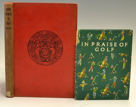 Caw, William - "King James VI Golf Club -Record and Records" 1st ed 1912 in the original pictorial red cloth boards (spine faded and discoloured) with various illustrations including a coloured plan of Moncrieff Island Course by Mr DM Cuthbert to the rear- internally clean hence overall (F/G) plus - Evans, Webster and Tom Scott (ED) "The Praise of Golf-an Anthology for Lovers of the Game" 1st ed 1950 in the original decorative paper boards (A/F) internally clean with illustrations (2)