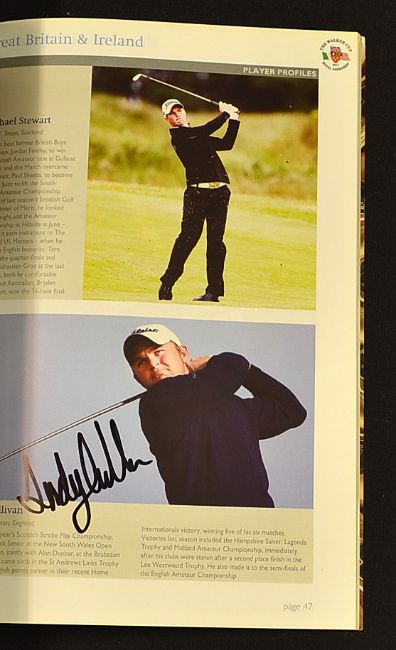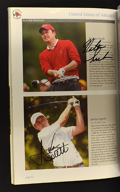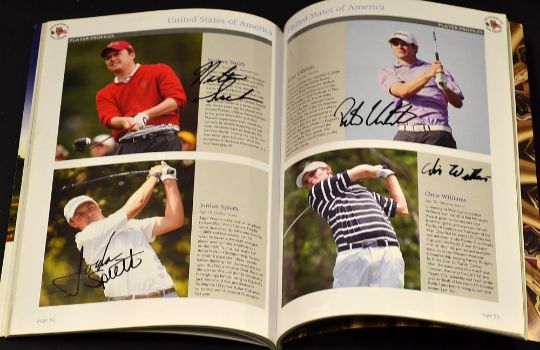2x 2011 Official Walker Cup signed programmes - both signed to their player profiles and past Walker Cup players to incl GB&I past players Paul Lawrie, Padraig Harrington and team members Stephen Brown, James Byrne, Andy Sullivan, Jack Senior, Simon Dyson, and Dustin Johnson (USA) to the one and the other includes the entire GB and I team together with the entire USA team which includes Jordan Spieth, Chris Williams, Nathan Smith, Kelly Craft, Russell Henley, et al and finally 2003 official US Walker Cup signed team sheet to include bill has, Ryan Moore, Lee Williams, et al (3)