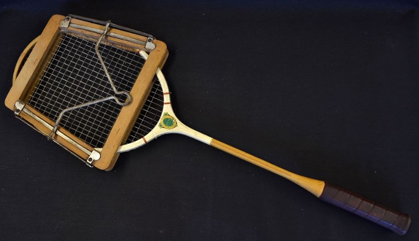Collection of 3x Tennis ball boxes and badminton racket to incl the Slazenger Lawn Tennis Box c.1947 c/w removable lid and containing 6 tennis balls 2x stamped Slazenger, 2x Dunlop tennis ball boxes including LTA 1959 with 6x Dunlop tennis balls and Dunlop Fort 1974 with 5xDunlop tennis balls all stamped Dunlop and a Slazenger Demon wooden badminton racket with leather grip and racket press (4)