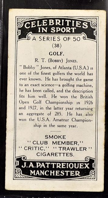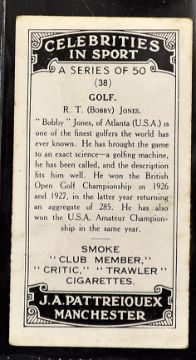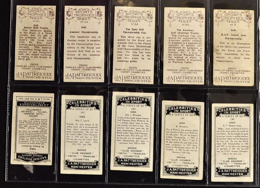 Collection of various Pattreiouex Manchester golfing cigarette cards from the 1920/30's to include 4x "Celebrities in Sport" featuring Bobby Jones, Joyce and Roger Wethered, and Cecil Leitch (F/G), 5x "Sports Trophies" corner crease to one otherwise (F/G) and "Railway Posters by Famous Artists" featuring what would appear to be Gleneagles