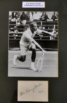 H.W "Bunny" Austin signed tennis display - with good signature and dated 1933 mounted below an image of Austin playing with his Hazells Streamline racket - mf&g 14" x 10"