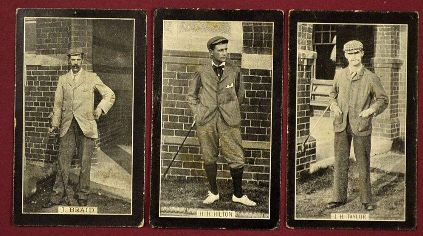 3x F&J Smith's Golf cigarette cards c.1902 - Champions of Sport Series blue backed real photographs to incl J Braid, J.H Taylor, and H.H Hilton