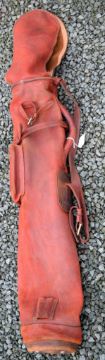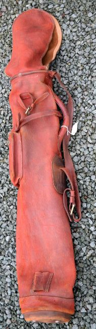 Full red leather pencil golf club bag c/w travel hood, ball pocket, the original matching leather strap and the original leather club divider overall (G)