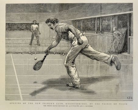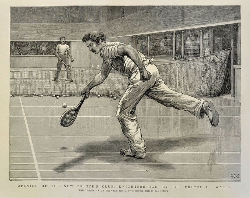 Scarce 1887 M.C.C Alfred Lyttelton Real Tennis Gold Plated Medal presented to Lyttelton for his victory in the M.C.C 'Gold Racquet' amateur real tennis competition in 1887 - a title he was able to secure on twelve separate occasions - to the obverse the M.C.C logo surrounded by the inscription 'Challenge Tennis Prize', the reverse engraved 'Won By A. Lyttelton 1887', diameter 51mm, weight 62.6g approx., complete with an engraving showing Alfred Lyttelton and Saunders on the court of Princes Club in 1889 (2) Note: Alfred Lyttelton QC (1857-1913) was a British politician and sportsman who excelled at tennis, football and cricket. During his time at University he participated in Varsity matches in five sports; real tennis, cricket, football, athletics and rackets. Arguably he was the pre-eminent sportsman of his generation and among numerous achievements was the first man to represent England at both football and cricket.