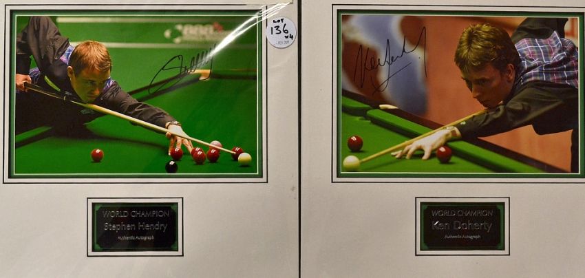 Snooker World Champion Signed prints to include Steve Davis, Stephen Hendry, Shaun Murphy and Ken Doherty, all colour prints, mounted and ready to frame, still in plastic wrapping largest measures 40 x 40cm approx. (4)