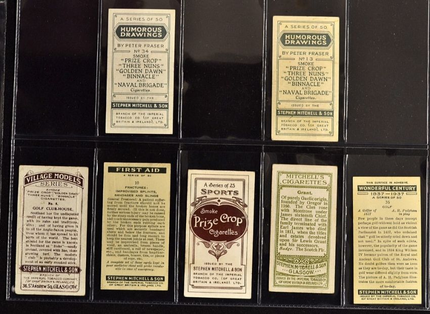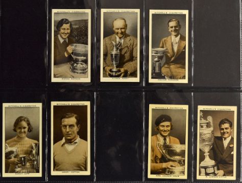 Collection of 14x various 1930's Stephen Mitchell and Son cigarette cards to incl 4x "A Gallery of 1934" and 3x "A Gallery of 1935" featuring Alfred Perry, Henry Cotton, Lawson Little, Mrs Andrew Holm, Nancy Jupp, et al plus 2x "Humorous Drawings" and 5 odds including Scottish Clan Series, First Aid, Sports, and Village Models series overall (F/G)