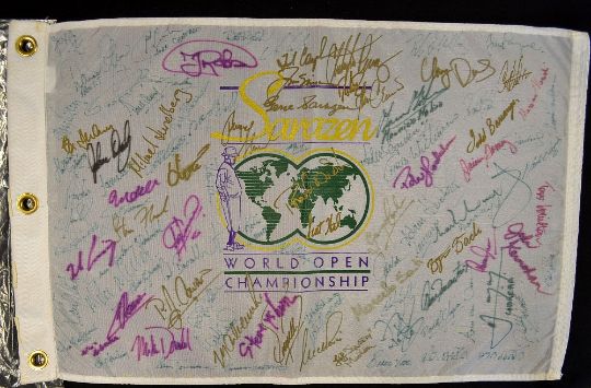 1996 Gene Sarazen World Open Golf Championship pin flag signed by the entire field including Payne Stewart, Jack Nicklaus, Gene Sarazen, Fred Couples, John Daly, Todd Hamilton, Mark Calcavecchia, Tiger Woods? et al