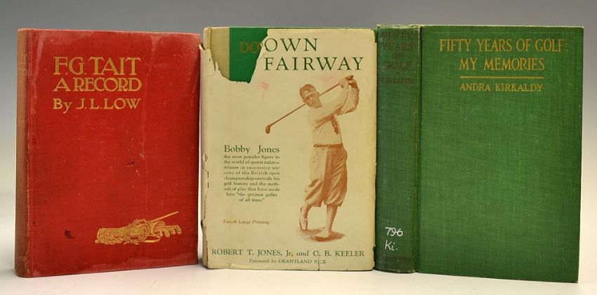 Early Golfing Biographies (3) to incl Andra Kirkaldy - "Fifty Years of Golf - My Memories" 1st U.S ed 1921 in original green and gilt golf boards Ex Parish Hall Library Boyce, Virginia clean internally and tight overall (F/G); John Low, - "F.G. Tait -A Record, Being His Life, Letters, And Golfing Diary" 1st ed published in the original pictorial red and gilt cloth boards and spine c/w photographed label of Professor PG Tait laid down to the front end board (A/F)and Robert T. (Bobby) Jones, and O B Keeler - "Down the Fairway-The Golf Life and Play of Robert T Jones Jr" 4th printing 1930 - c/w dust jacket retaining much of the original dust jacket although parts are torn and missing (F)
