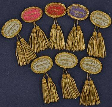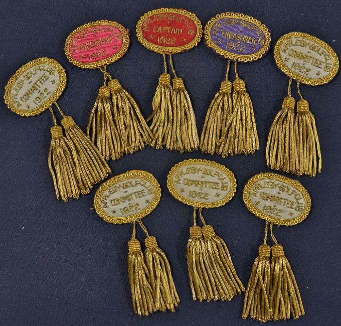Rare set of 1922 Appleby Golf Club officers badges (8) - to incl Captain, President, Treasurer, and 5x Committee Members gold braid and embroidered oval badges c/w tassels - the design and colouring owe their influence to the Freemason connections of the Brackenber Golfing Society who were instrumental in relocating the Appleby Golf Club to Brackenber Common in 1895
