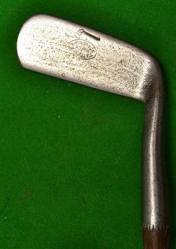 Early Tom Stewart unusual forward face blade smf putter stamped with the early pipe brand mark and makers oval cleek mark together makers shaft stamp just below the thick hide grip with underlisting