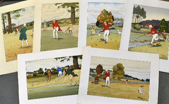 Elliott, Harry (After) SET OF 6 AMUSING COLOURED GOLFING PRINTS OF VICTORIAN GOLFERS PLAYING GOLF - each measures overall 17.25 x 13"