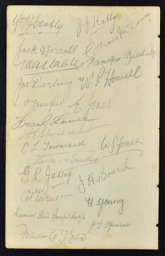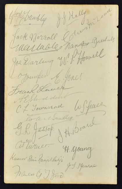 Rare 1899 Australian and England cricket team autographs from the match South England v Australia September 1899 at the Central Recreation Ground Hastings and include H. Trumble, Victor Trumper, J. Worrall, F. J. Laver, M. A. Noble, C. E. McLeod, W. P. Howell, E. Jones, J. J. Kelly, F. A. Iredale, J. Darling. Plus England team signatures W. G. Grace, W. M. Bradley, C. L. Townsend, A. E. Stoddart, K. S. Ranjitsinghji, A. J. Turner, G. L. Jessop, F. G. Ford, J. H. Board, H. I. Young, J. T. Hearne, - very rare collection signatures