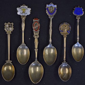 6x various silver and enamel golf club crested tea spoons incl Whitefield Golf Club, St Dunstans, R.P.G.C, Davy Hulme Park GC, Lion Rampant & White Crosses and Holme Hall Golf Club with lady golfing figure (enamel chipped) wt. 4oz# (6)