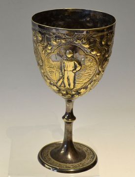 Victorian large embossed cricket challis - heavily chased embossed boel with featuring a cricket batsman at the wicket, scrolled surround - overall 7.75"h ( needs re-plating)