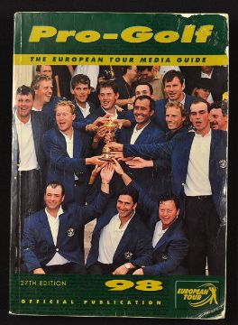 1998 European Tour Media Guide signed by 151 players to their player profiles including Tiger Woods and 21 x Major winners notably Ballesteros, Calcavecchia, Clarke, Crenshaw, Els, Faldo, Goosen, Harrington, Langer, Leonard, Love, Olazabal, O'Meara, Norman, etc. A full list of those who have signed is included within the Media Guide. Each signature is signed to the player's profile