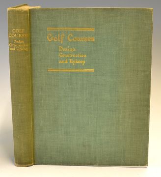 Sutton, Martin - "Golf Courses, Design, Construction and Upkeep" 1st ed 1933 in original green and gilt cloth boards and spine, with introduction by Bernard Darwin, containing many photographic and other illustrated plates throughout - some slight shelf wear to top and tail of spine and extremities, very minor speckle foxing to the front plates otherwise internally very clean (G)