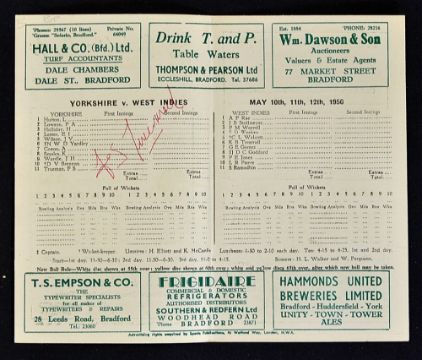 Official cricket score card Yorkshire v West Indies May 10 1950 autographed by England bowler Freddie Trueman