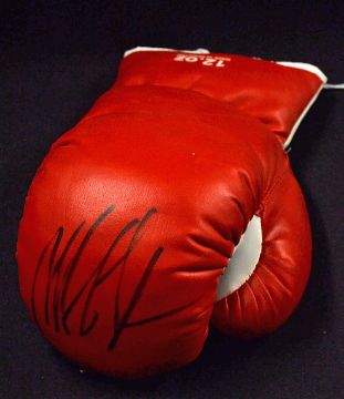 Mike Tyson Signed Boxing Glove and Print a 12oz replica glove signed in black ink, t/w a montage colour print signed in ink measures 51 x 66cm approx. (2)