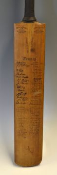 1939 West Indies cricket tour to UK signed cricket bat - full size Gunn and Moore "County" cricket bat hand written on the back to the top right hand shoulder W Voce and profusely signed by the West Indies (14) together with 9x County sides to incl Yorkshire (12), Notts (12), Worcestershire (11), Derbyshire (12), Somerset (11) and to the front Middlesex (12), Surrey (13), Gloucester (12) and Sussex (11) all signatures are clear - in all 120 signatures from the pre-war era incl many iconic names (G)